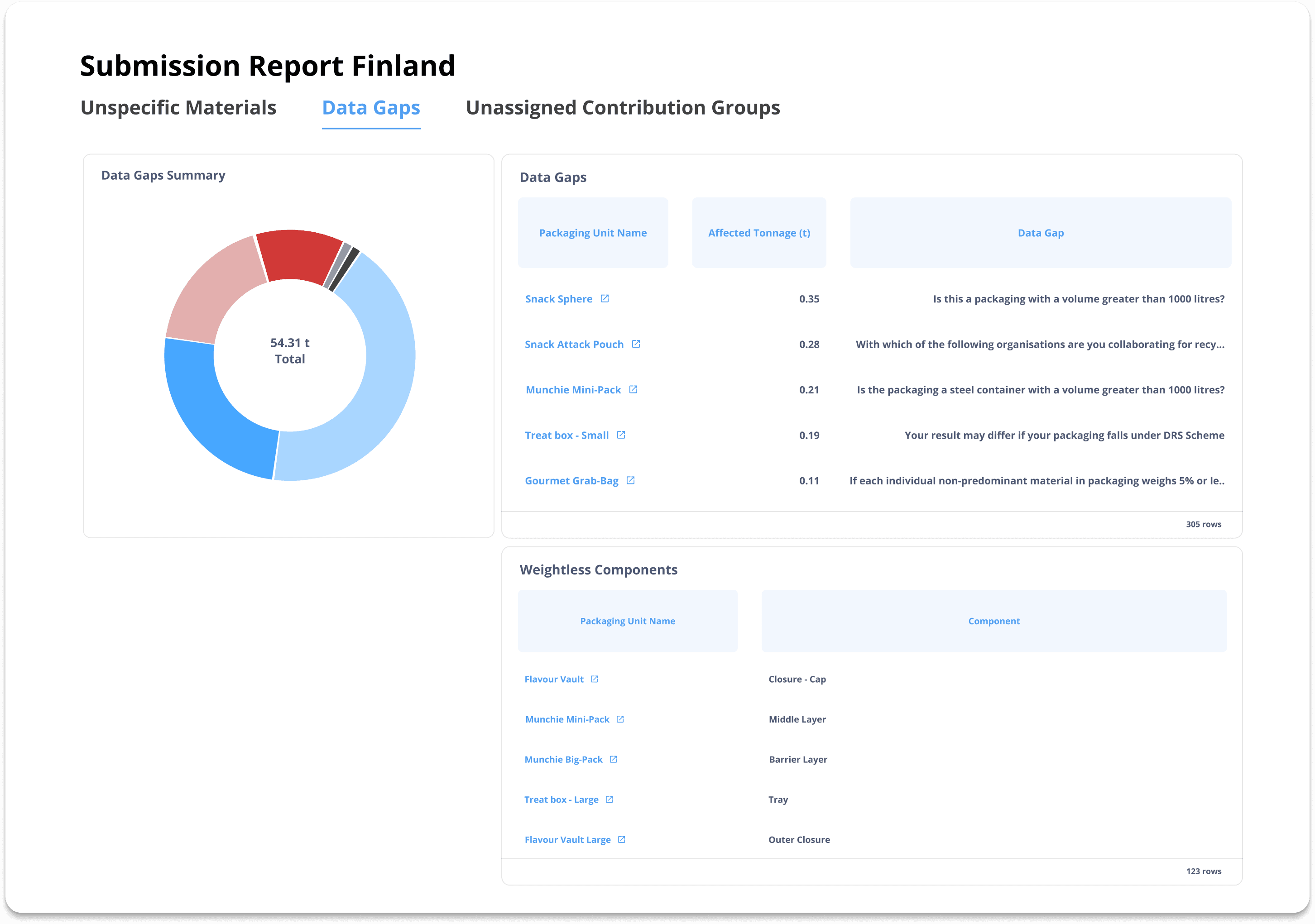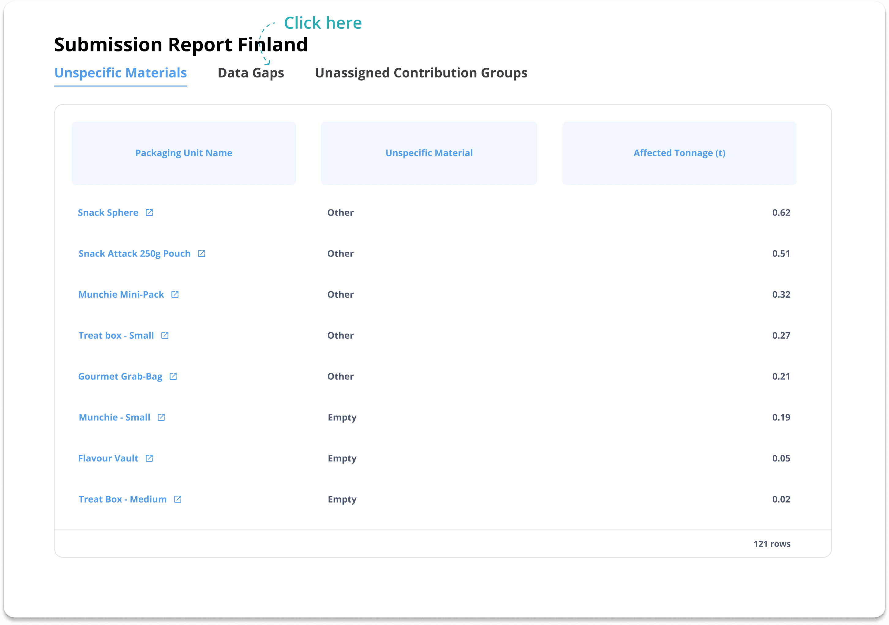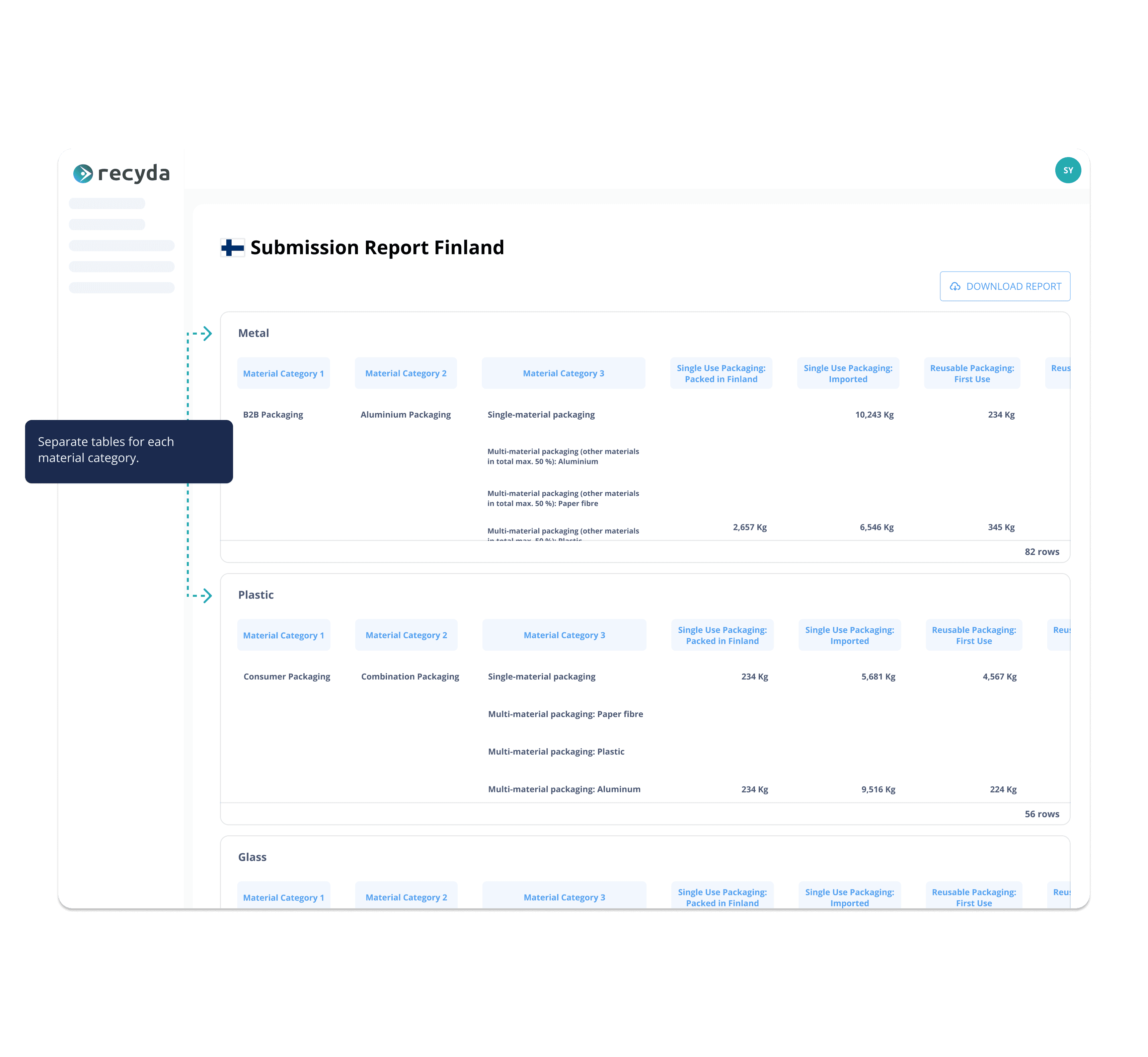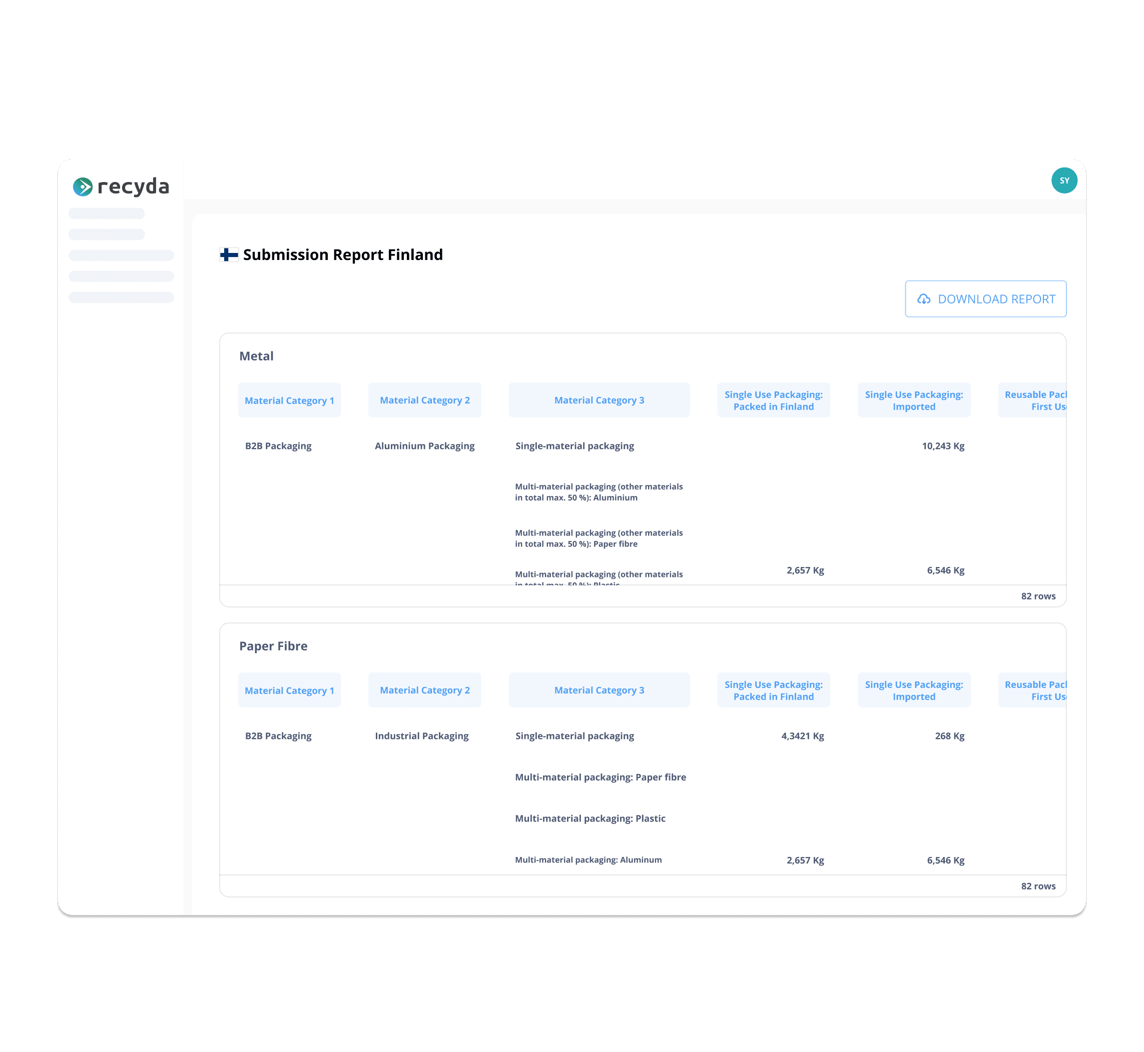 Download a ready-to-submit report with data entered into the tables and columns as needed by your PRO (e.g. Finnish Packaging Producers Ltd.).
