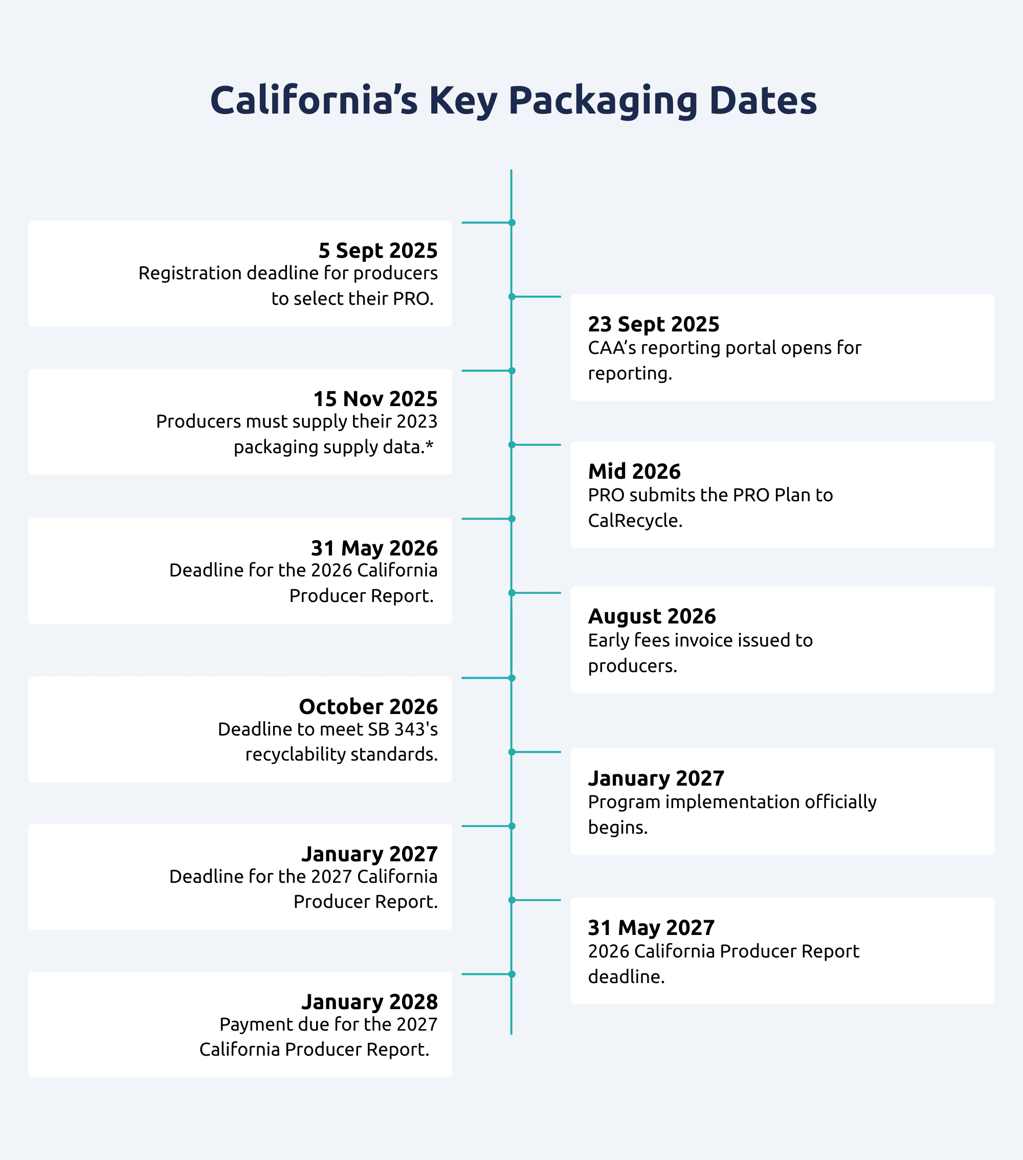 *15 Nov 2025 (Initial Baseline Reporting): Producers must submit their 2023 packaging supply data (weight, material type, etc.) to CAA. This data is used to establish the program's baseline and calculate future fees, which will not commence until 2027.